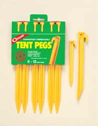 Stake down tents, tarps, and other items with these durable tent pegs. These bright pegs are easily seen and the "no slip" hook is designed to keep your area secure. 6/cd.
