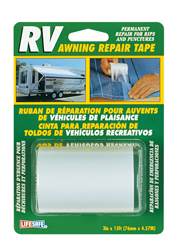 The Vinyl Awning Patch kit shown at left repairs sizeable tears in vinyl patio and vinyl window awnings. Two 5" x 5" self-adhesive patches adhere to metal, wood, plastic, rubber and more. The Awning Repair Tape pictured at right above is a must for your RV toolbox! Clear tape offers the utmost in durability, strength and unbelievable adhesion even on damp surfaces. Aggressive adhesive repairs canvas, vinyl, rubber - most anything. 3 in. x 15 ft. roll.