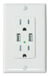 Dual USB Charger with Duplex Receptacle ? Hubbell Electronics partner provides a great solution to all your charging needs. Includes 2 high output 3.0 amp USB Chargers for the quickest charge around and 2 tamper resistant power outlets. Can use all simultaneously. UL Listed. 15A/125V AC. White is shown.