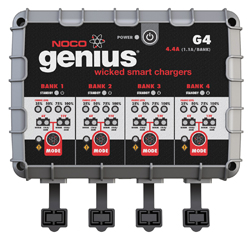 The G4 is a smart, 7 Step, fully automatic switch-mode battery charger and maintainer with 4 independent battery banks. The G4 allows different battery sizes, voltages (6V or 12V), and chemistries to be charged at the same time safely and efficiently. The G4 is best for charging multiple small battery applications from 2.2-40Ah, such as Motorcycles, ATVs, Jet Skis or Snowmobiles. In addition to charging, the G4 can effectively maintain any 6V or 12V batteries in larger applications, such as Cars, RVs, Boats, and Trucks. With 4 independent battery banks, the G4 is the best way to keep all of your vehicles maintained at the same time.