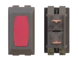 Standard indicator lamp, water heater, monitor panels illuminated in the "on" position. 10A @ 14V DC, UL, CSA, VDE. 1.23" x .68". Cut-out: 1.125" x .55".