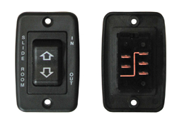 Square 5-pin slideout switch. High output 40A durable switches are contoured for a clean look. Use 5W-125 or 5W 1212 harness. 40A @12V DC, UL, CSA, VDE. 1.75" x 1.10". Cutout: 1.46" x .94". DPDT. _x000D_