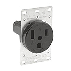 50A, 125V NEMA 5-50R, 2 pole, 3 wire, flush mounting receptacle, straight blade, industrial grade, grounding, side wired, steel strap, black.