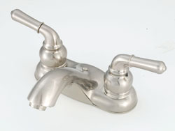 4" metal lavatory with teapot lever handles and arc spout. Lead free.