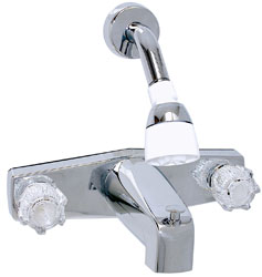 Two handle 8" tub/shower diverter. DuraPro? underbody. Plastic stems. Showerhead, arm and fl ange included. Clear acrylic handles. Chrome finish. White/chrome showerhead.