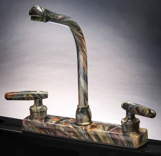 Faucet; Used For Kitchen; Single Piece 8 Inch Deck Mount; Hi-Rise Spout; 2 Lever Handle; Green Camouflage; Brass Compression Cartridge Valve