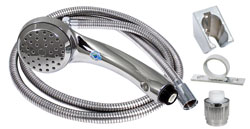 Single function Airfusion shower head will use 20% less of your precious water supply wile providing a high pressure spray. Kits include hose guide, 3 position shower bracket, and 60" hose. Chrome and clear kits include a stainless steel hose, white and brushed nickel kits include matching vinyl hoses.