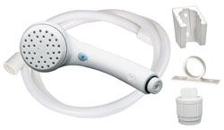 Single function Airfusion shower head will use 20% less of your precious water supply wile providing a high pressure spray. Kits include hose guide, 3 position shower bracket, and 60" hose. Chrome and clear kits include a stainless steel hose, white and brushed nickel kits include matching vinyl hoses.
