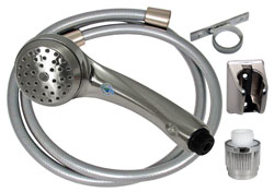 Single function Airfusion shower head will use 20% less of your precious water supply wile providing a high pressure spray. Kits include hose guide, 3 position shower bracket, and 60" hose. Chrome and clear kits include a stainless steel hose, white and brushed nickel kits include matching vinyl hoses.
