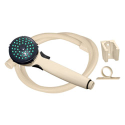 Single function spray head has a water saving trickle valve on the hand set. Kits include matching finish hose guide ring, 3-position shower bracket, mounting hardware and 60" hose. Chrome kit includes a double hooked stainless steel hose, white and biscuit kits include matching vinyl hoses.