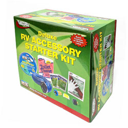 Kit includes: One lead-free brass water regulator, one 30/15A electrical adapter, one 20' EZ Flush brown hose, one box of RV dump gloves (12/pk), two 1-pk 2-ply toilet tissue, four 2 oz. RVT Eco Force Dry, one ?" x 25' drinking water hose, one RV 101 Literature book and one Bill?s Hints Coupon Booklets.