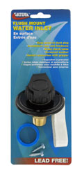 Plastic flange lead-free water inlet with 1/2" MPT inside connection. Includes a brass check valve, garden hose swivel fitting with gripper and press-in dust plug.