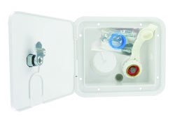 Gravity fill and lead-free brass city water fill with 1/2" MPT tank connection in a lockable hatch. Paintable UV stabilized plastic with 1/2" air vent for a fast fill. Cut out: 5-7/8" W x 4-3/4" H; OD: 7-5/8" W x 6-1/2" H