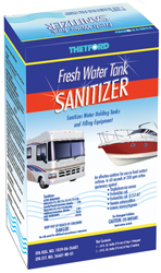 New fresh water tank sanitizer from the industry leading Thetford Corporation. This two-step treatment system cleans, disinfects, and sanitizes RV holding tanks and drinking water hoses. The treatment chemical kills bacteria and eliminates offensive odors but it is safe for drinking water systems. The kit treats up to 96 gallons.