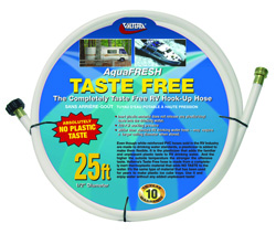 A completely Taste Free RV Hook-Up Hose from Valterra. The inert plastic material does not release any plastic/vinyl taste into the drinking water. Stiffer than standard RV drinking water hose ? may require a larger coiling diameter when stored. Functions to water pressure up to 120 psi. ?" x 25'.