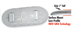 NEW Slim Line 12volt Double Pancake LED Light Fixture. Features 2 of our 18 SMD diode "warm white" led bulb for superior light output. Great for new installation or replacement fixtures. Surface mount and easy to install, 2 wire. Three way switch provides lighting from one side of the unit or both. 3500 Kelvin and approximately 350 lumen output. Size - 11" x 4.5" x 1.0". To cover up old square stlye fixtures use part 52552 (bezel) in conjunction with this item.