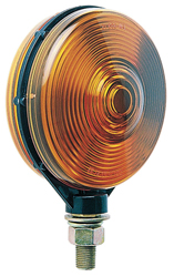 Pedestal-mount, double face amber light functions as combination turn signal, parking light or warning light. Durable, black plastic housing with two snap-on amber lenses. Two lead wires exit through 1/2" diameter mounting stud. Grounds through mounting stud. Converts to single-face amber light by snapping on black back.
