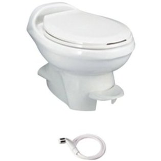 Thetford Aqua Magic V RV Toilet The Aqua Magic V by Thetford is the most popular RV toilet in North America. The Aqua Magic is an economical choice and a solid, day-after-day performer. This RV toilet is available with dual-hand or convenient dual-foot pedal operations. This model is also available in high (17-2/5") or low (12-9/10")profiles to fit your specific space requirements. This RV toilet offers a taller, more comfortable seat and single-control fill and flush for full-bowl wash-down every time you activate the hand lever or foot pedal. Its contemporary design is lightweight, easy to install and service. Textured lid sheds water and resists scuffs. Models with Water Saver include a powerful, convenient manual rinse for easy cleaning.NOTE: Due to Fedex and UPS hazmat regulations, expedited shipping is not available for toilets. Standard ground transportation will be used for all toilets.