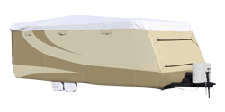 ADCO Designer Series Travel Trailer cover protects your trailer in style. Zipper entry panels. Breathable. 3-layers on top and sides. Cinching system on both ends. Reinforced corenrs. All Climate protection. Vents. Weighted toss-under buckles. Storage bag. 2 year warranty. Tan and White.