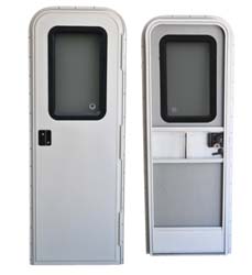 Towable Entry Door- Radius: Polar White 1000 fiberglass skin, white flush lock with deadbolt 12 x 21 window with obscure glass and white frame, all white aluminum extrusion.