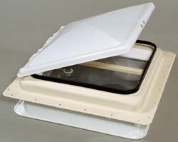 Non-powered, 14" complete roof vents with deep drawn metal bases painted off-white, white screen and white garnishes replace Jensen metal base standard mount vents. Fits roofs 1" to 2-9/16". Features radius corners, positive-seal weatherstripping, a unique integral hinge system lid and an acrylic UV resistant translucent lid.