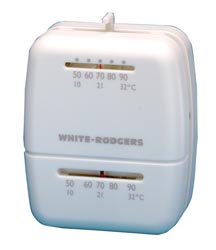 Exclusive heat only and heat/cool thermostats replace 24 volt or multi-volt heating systems. Replaces round, vertical or horizontal thermostats. Adjustable thermometer allows matching of thermometer and temperature setting. 1 per pack.