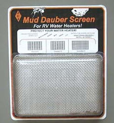 This mud dauber screen keeps pesky mud daubers, mice, wasps, frogs, birds and spiders from nesting in your Atwood 6 or 10 gallon or Suburban 6 gallon water heater. See dimensions in price list. This mud dauber screen is easily installed with attachment springs and installation pin (included).
