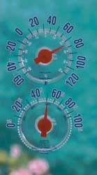 Read outdoor temperature and humidity at a glance. Easy to read numbers. Clear plastic dials adhere to glass.