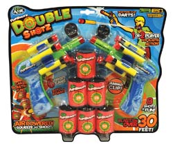 Double the Pop Shotz punch with two Pop Shotz blasters and 6 target cans! Get ready for some action on the range set 'em up and shoot 'em down. Play with a friend or come out solo, daouble barrels blazing. Includes 2 Pop Shotz Blasters and 6 Target Cans. Ages 5+.