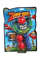 Soft, safe foam ball slingshot. Includes an injection molded hand held sling shot that launches a foam ball. Includes 3 foam rubber balls. The ball travels a maximum of 45 feet.