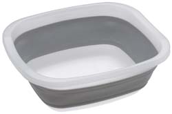 Space saving collapsible tub is great for washing dishes and other household tasks. Feet allow water to drain underneath. Collapses to 1/3 its original height for storage. Dishwasher safe.