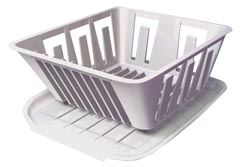 This RV dish drainer is made of durable plastic and is compact enough to fit in most small sinks. Use this RV dish drainer to keep your dishes clean and sanitary. The nice plastic will keep your dishes from chipping while they dry out of the way. Included is a handy mat to place underneath and prevent messy water spills on your counter. The small size is easy to store when you are finished with your dishes.