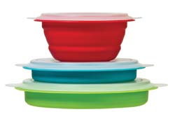 Space saving collapsible bowls are perfect for prep work, heating or storing. Expand to use or collapse to store! Set of 3 bowls with lids in 1.5 ounce, 3 cup, and 5 cup capacities. Dishwasher safe.