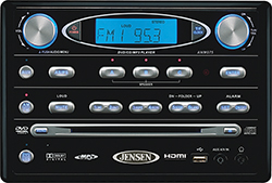 - > 12V DC power > AM/FM electronic tuner (US/Euro) > NOAA 7 station Weatherband tuner > Full iPod audio controls & charging(requires interface cable - sold separately) > HDMI with CEC video output that when used with Jensen LCD TV's with CEC feature, allow you to control functions of both with one remote > 720p and 1080i source resolution selectable by menu > Digital audio input (1 - Coaxial, 1 - Optical) > 3 level user selectable dimming display (Power Off) > Front panel headphone out (1/8" Jack) > Front USB support playback MP3/WMA/JPEG format > 1 - Front Aux A/V input (1/8" jack) > 1 - Rear Aux A/V input (RCA Jacks) > 1 - Rear Aux Audio input (RCA jacks) > 2 - Rear video composite outputs > Fully suspended slot-type CD/DVD deck mechanism > 30 programmable dtation presets (18FM, 12AM) > Auto-store/Preset scan > Alarm clock with sleep timer > Low, medium & high adjustable LCD dimmer setting > External IR repeater input > Wireless remote included