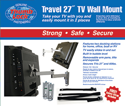 LCD flat panel articulating wall mount for use with screens up to 37" with VESA 200 mount pattern. Features dual docking stations, one for mounting in the home, the other in the RV, or one for inside and outside of the RV. Securely holds up to 55 lbs. while arm extends up to 7" from the wall. Features three hinge pivot system and swivel mount head for limitless viewing angles, built-in level and cord management hook, and easy "on demand" knob adjustment ? no tools required. Safety Straps included to protect your TV during travel.