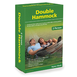 Handmade from nylon and other materials, this hammock is strong enough for two adults to lounge away the day. Portable and compact, you can take this hammock along on almost any outing. This hammock is comfortable, yet rugged and durable for camping, picnics, at the cottage, or in the backyard. Also useful for above-ground camping storage. Wide enough for two adults. Hammock Length: 108” (274.3 cm). Rope Length: 63” (160 cm)