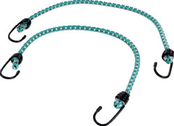 Set of two durable stretch cords. Ideal for camping and outdoor use. Weather-resistant outer layer. Coated hardened-steel hooks and flexible rubber core.
