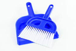 Travel-sized tent whisk snaps into dustpan to keep them together for convenience.