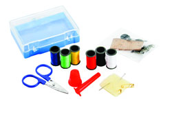 Travel-size sewing kit contains 50 yards (45.7 m) assorted thread, 5 needles, needle tube, needle threader, thimble, 8 buttons, 2 snaps, 5 safety pins, 2 straight pins, measuring tape, scissors and plastic box.