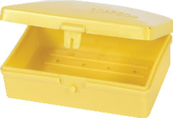 Covered soap dish with a securely snapping lid closure and vent holes in the bottom.