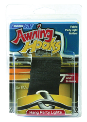 Sturdy sewn fabric tabs with grommets slide easily into your roller bar channel to hold lights, wind chimes and more. When storing awning, just remove the hooks; tabs can be left in place. Includes 7 tabs and hooks.