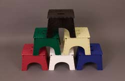 9" tall plastic steps fold to an easy to store 2" width! Step surface is 9"H x 10-5/8"W x 9"D open. Base is 12-1/4"W x 10-7/8"D open. Skid resistant top and convenient carrying handle. 300 lb. weight capacity.