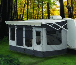 These RV screen rooms are specifically designed to fit the Carefree 12V Eclipse and Travel?r as well as all brands of traditional patio awnings. Set-up is fast and easy with this one piece complete room design (front and side panels are all one piece).There are no poles, rafters or permanent fasteners to attach to your coach. When one side of the awning is lowered to prevent water pooling during rain, the room simply folds with the awning.The screen room features include multi-setting privacy panels, ground stakes, tall skirting for the open areas under the RV, and a zippered, tote style storage bag.