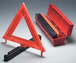 A must for highway safety! Three reflective safety triangles setup in minutes and store away in a compact case. Designed for vans, pickups, motorhomes and heavy-duty trucks. D.O.T. approved. 3 triangles per box.
