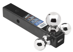 This Tri Ball trailer hitch mount fits a 2" receiver opening and has a solid shank with a black enamel powder-coated finish. The 1-7/8" ball towing capacity is 3,500 lbs. The 2" capacity is 6,000 lbs., and the 2-5/16" ball rating is 10,000 lbs.