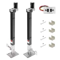 The only Fifth Wheel Landing Gear System that features heavy-duty integrated die-cast gearbox, which eliminates the need for an intermediate plastic gearbox. Dual drive models allow independent control of each landing gear leg and are perfect for high torque or high speed applications. High speed position results in lifting speeds of 9" per minute, twice as fast as the competition. Dual Drive, Output Motors Preassembled to Jacks, Includes Two Switches & Panel, Wiring Harness, Mounting Hardware & Spring Loaded Drop Leg Pins. Industry leading 5 year warranty.