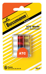 Buss ATC products use the industry's universal color coding to indicate amperage. Assortment includes one each the 5, 10, 15, 20, 25 & 30 amp ATC fuses, per package.