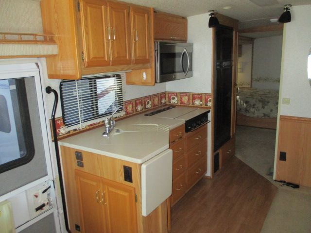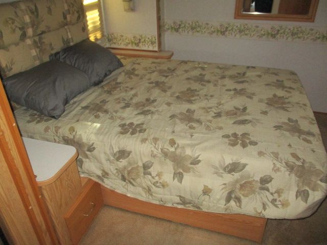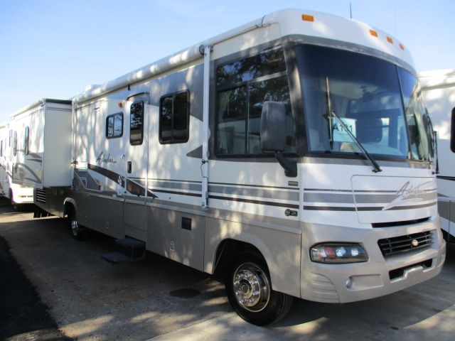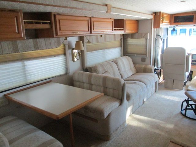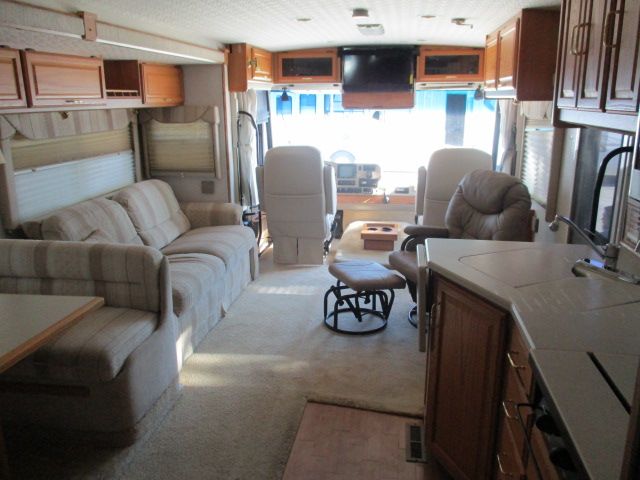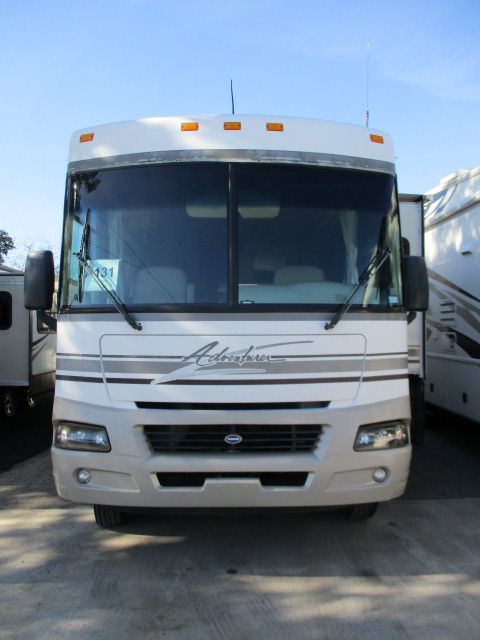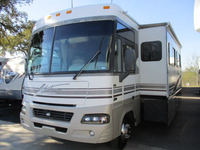 This 2003 Adventure has a Vortec GM Engine On a Workhorse Chassis, 2 Slide-outs, Onan Gas Generator, Basement A/C, Levelers, Double Door/Icemaker Refrigerator, In-Fridge Ice Maker, Main & Slide Awnings, Backup Camera, CD Radio, Solar Panel, Satellite Dish & Receiver, TV, Outside Shower, Convection Microwave, 3 Burner Range