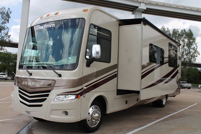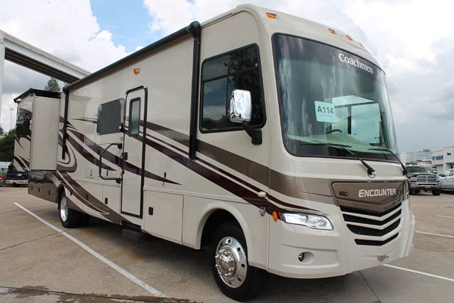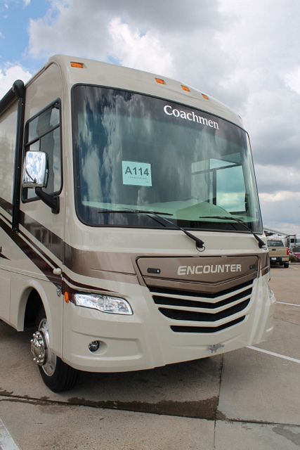 Wow ! (Low-Mileage) This Nearly New 2015 Coachmen Encounter (50th Anniversary) with bath and half is loaded with comforts. It has a V10 Ford Triton Engine on a Ford Chassis, Amenities include....2 Slide-outs, Onan Gas Generator, 2 Ducted Roof A/Cs, Levelers, 1000 Inverter, Fireplace, 18'CF Residential Double Door Refrigerator with Ice Maker, Main & Slide Awnings, 1 Piece Washer/Dryer, Backup and Side View Camera System, Satellite CD Radio, Outside Entertainment System, 3 TVs, 2 DVD Players, Home Theater System W/Sub Woofer, Surround Sound, Outside Shower, 30" Convection Microwave and 3 Burner Range. Upgraded tile floor, 96" Sofa/Sleeper, Upgraded Queen Mattress and so much more...