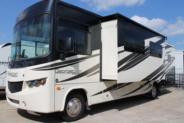 This Nearly New 2015 Georgetown By Forest River has a V-10 Ford Engine On a Ford Chassis, 3 Slide-outs, Onan Gas Generator, 2 Ducted Air Conditioners, Levelers, 110V Residential 3 Door Refrigerator with Ice Maker and Water in Door, Electric Main, Slide Awnings, 1 Piece Washer/Dryer, Backup Camera, CD Radio, Heated Tanks (Enclosed Tanks), 2 TVs, DVD Player, Outside Shower, Convection Microwave, 3 Burner Range and Oven. Bonus: Slide-out tray in lower compartment for easy access and Outside Entertainment System for hours of outdoors enjoyment.